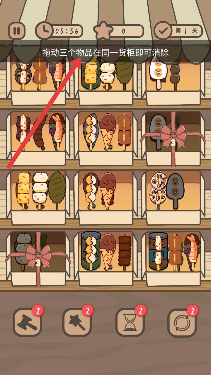 1、進入游戲,看到有多個貨柜每個貨柜里放著不同物品,上方提示拖動三個物品在同一貨柜即可消除,開始嘗試消除物品。