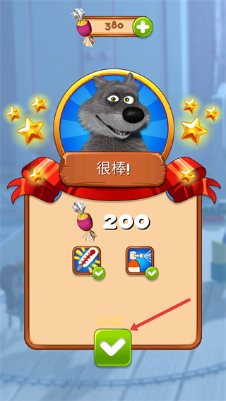 3、成功治愈狼后,會出現很棒的評價,還能獲得獎勵,點擊對勾確認完成治療,領取獎勵,為后續治療其他動物做準備。