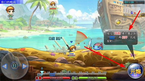 1、操控角色戰斗,需按住開炮按鈕使力度達到合適程度再松開,完成發射,攻擊敵方目標。