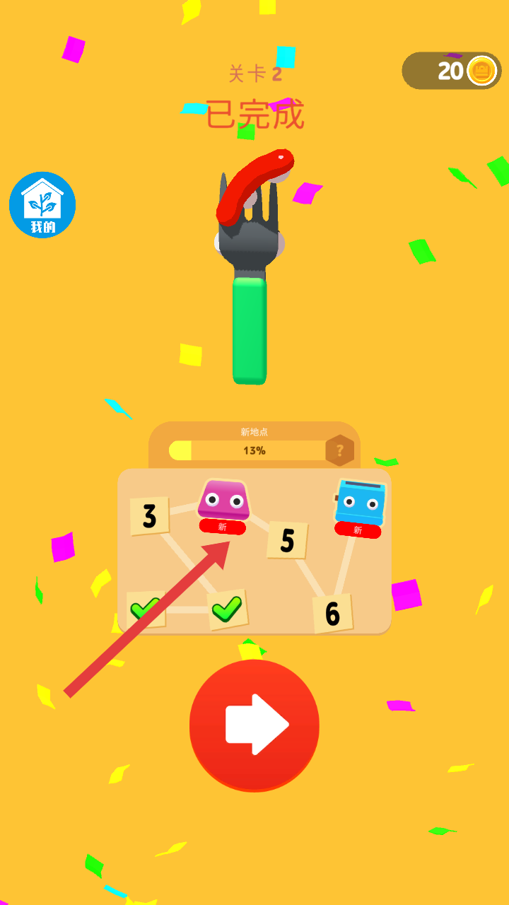 3、關卡完成后會顯示已完成,可點擊紅色箭頭按鈕,前往新解鎖的地點,挑戰后續關卡。