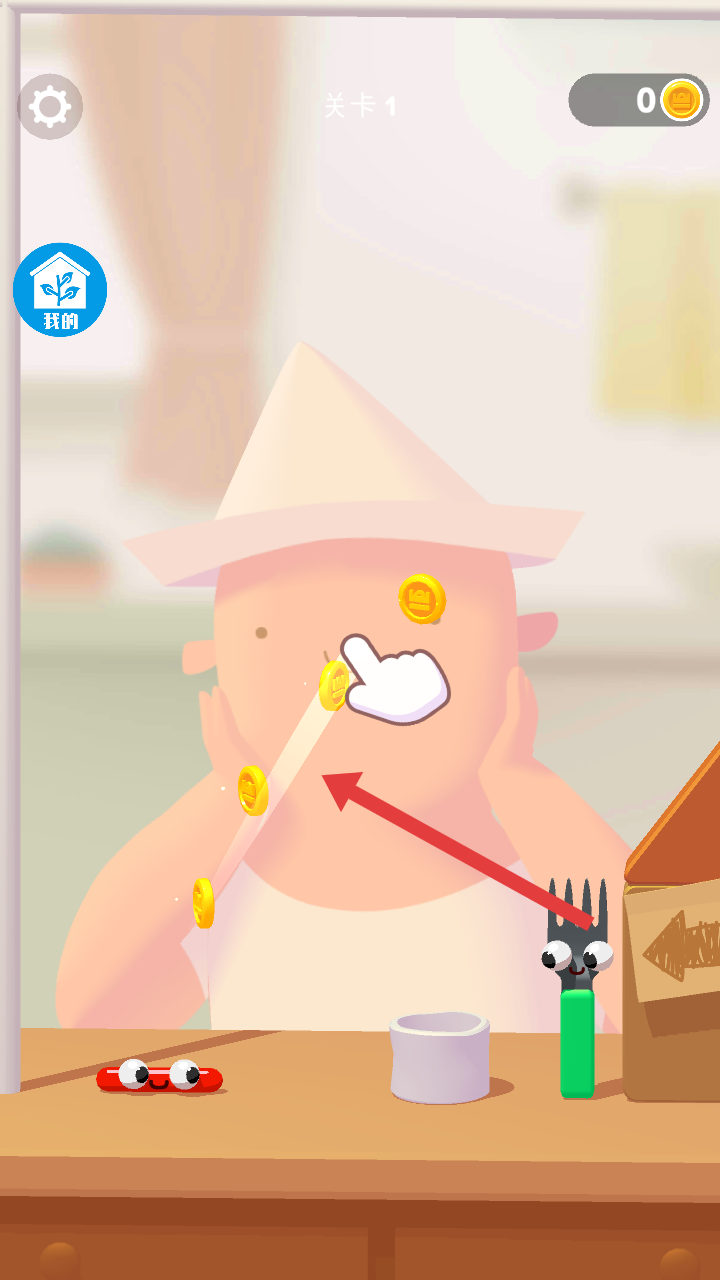 1、進入游戲從關卡1開始,按照提示操作,用叉子去叉香腸,完成關卡任務可獲得金幣。