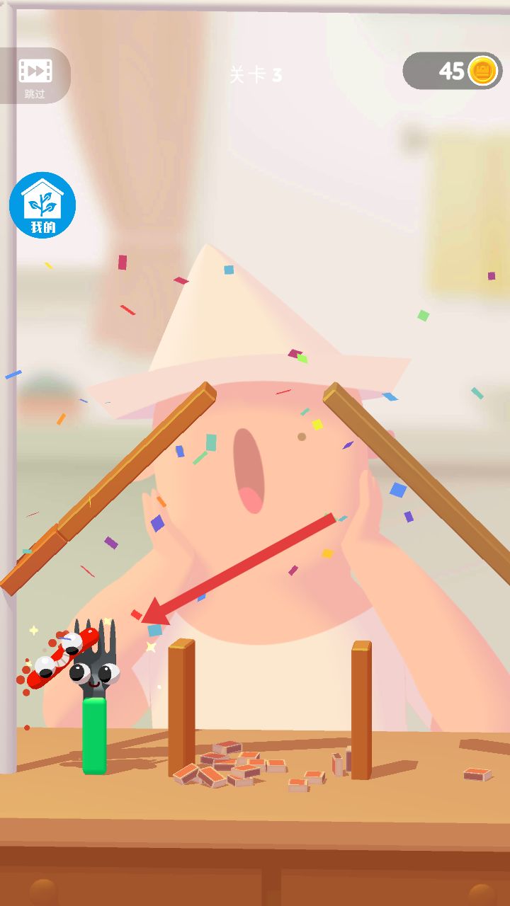 4、到關卡3場景有所變化仍需用叉子叉香腸,完成操作后會有彩色紙屑等特效,繼續積累金幣,推進游戲進程。