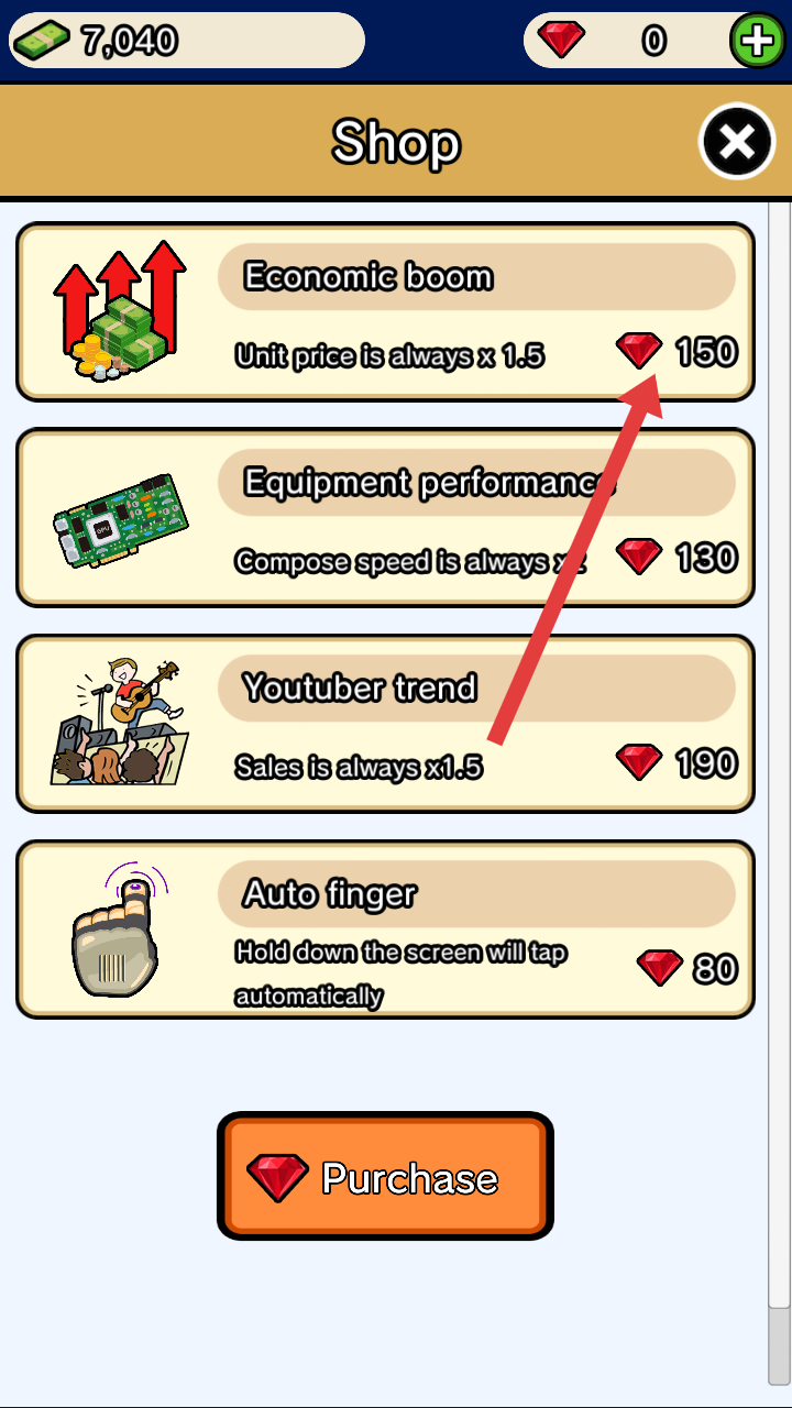 3、前往Shop界面,可用鉆石購買增益效果,例如Economicboom能讓單價始終增加,助力提升收益。