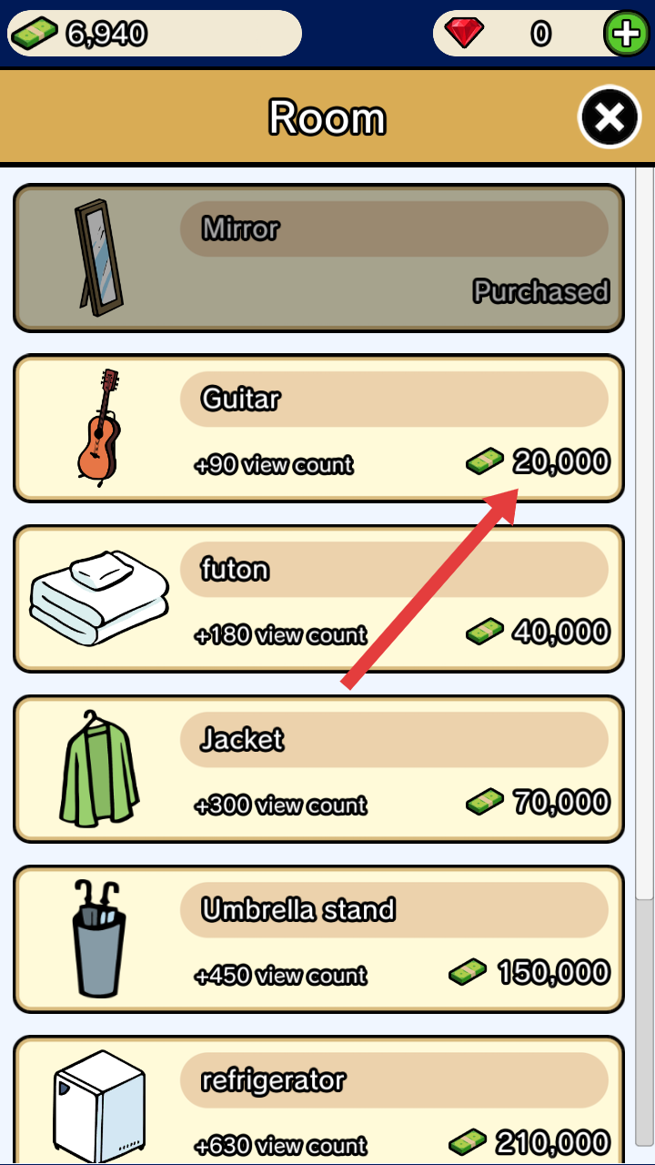 2、Room界面能花費金錢購買物品像吉他、被褥等,這些物品可增加視頻的觀看量讓你賺更多的錢。