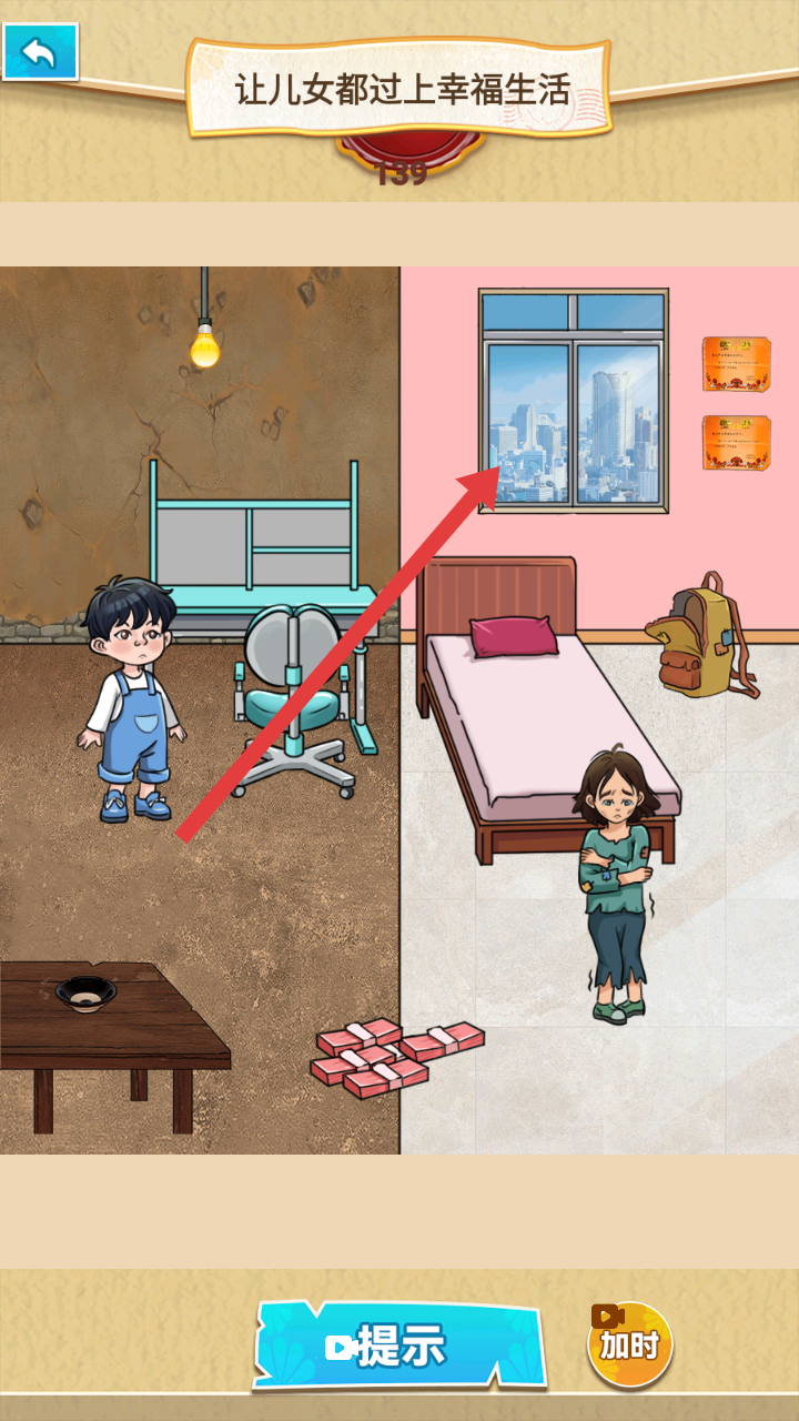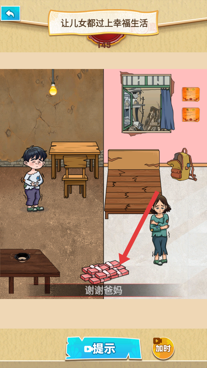 2、讓兒女都過上幸福生活關卡里,可通過給予資金等操作,改善兒女生活環境,從簡陋場景逐步變得更好。