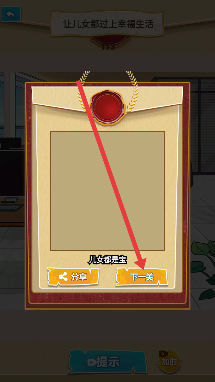 4、成功讓兒女過上幸福生活后,會顯示兒女都是寶,可選擇分享或進入下一關,繼續體驗其他家庭主題關卡。