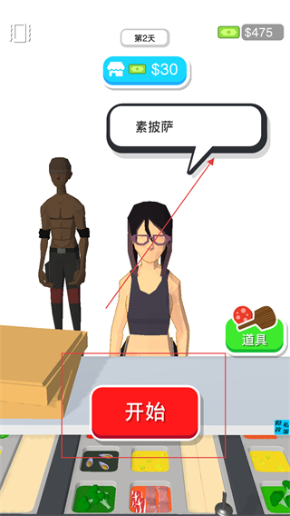 1、在游戲界面中查看顧客需求,然后點擊開始按鈕進入披薩制作環節,根據顧客要求準備制作披薩。