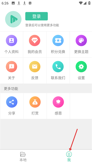 4、個人中心,登錄后可使用個人資料、會員等功能,還有關于、反饋等選項,底部我的導航欄聚合各類個人功能。