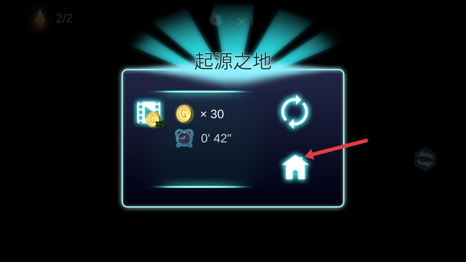 4、當收集完所有晶體后,會彈出結算界面,顯示獲得的金幣和用時等,點擊房屋形狀的按鈕,就能返回游戲主界面。
