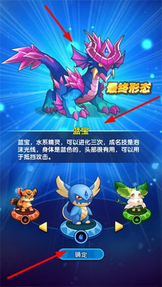 1、選擇水系精靈藍寶,它能進化三次,成名技是泡沫光線,確定選擇后開啟精靈養成之旅。