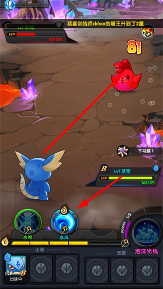 2、藍寶可使用凍風等技能攻擊敵人,如對弱雞造成傷害,合理運用技能提升戰斗效率。