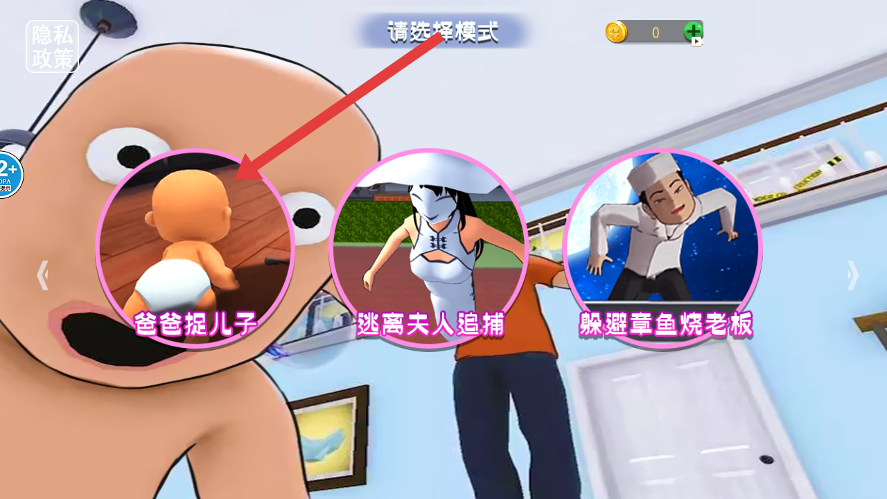 1、進入游戲,可選擇爸爸捉兒子,逃離夫人追捕,躲避章魚燒老板等模式,選擇爸爸捉兒子進入。