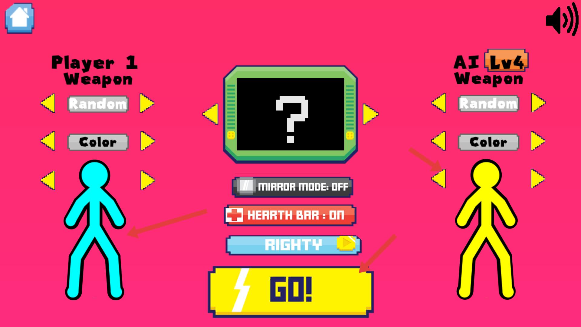 2、在設置界面,可調整玩家武器,顏色等,也能設置鏡像模式,生命條顯示等,調整好后,點擊GO,進入戰斗場景。