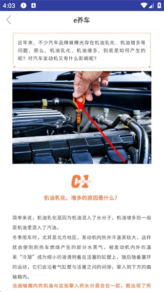 4、點擊發現界面的文章可進入詳情頁,這里會詳細解析汽車問題,如機油乳化增多的原因及影響,幫助用戶了解車輛養護相關知識。