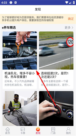 3、進入發現界面會收到存儲權限請求提示,這里展示e養車精選內容,包括汽車養護知識交通規則問答等,可瀏覽內容獲取用車相關信息。