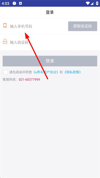 3、在個人中心頁面,點擊登錄相關區域,進入登錄界面,先勾選請先閱讀并同意e養車用戶協議選項,接著在輸入手機號、驗證碼,最后點擊登錄按鈕,完成登錄操作。