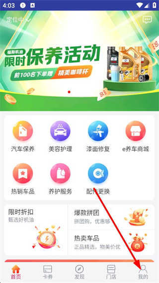 1、進入應用后可看到首頁界面,這里有汽車保養美容護理等功能入口,還有限時折扣爆款拼團等活動板塊,底部導航欄有我的選項,點擊可進入登錄界面。