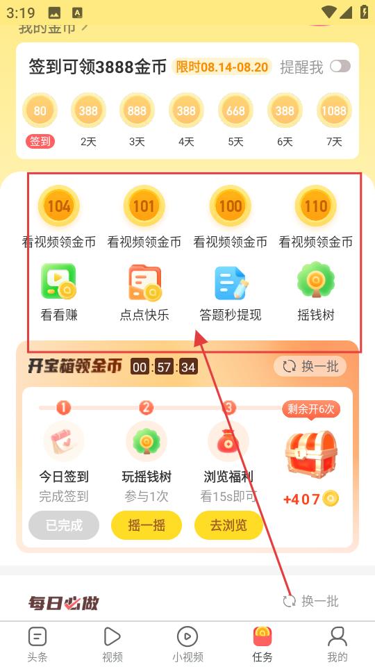 1、打開任務界面,找到看視頻領金幣區域,選擇看看賺、點點快樂等任務入口,點擊進入對應任務頁面,準備參與任務。