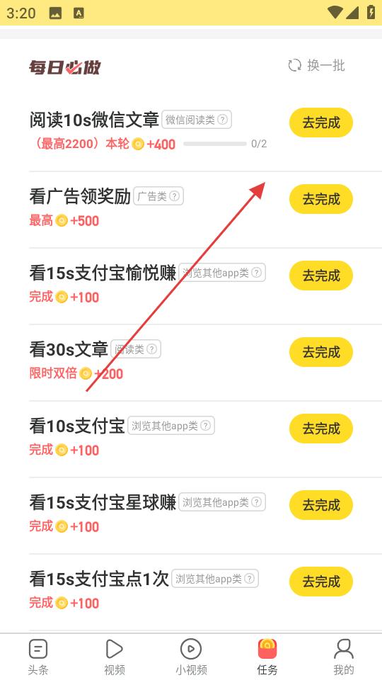 2、切換至每日必做板塊,瀏覽閱讀10s微信文章、看廣告領獎勵等任務,挑選想完成的任務,點擊去完成按鈕。