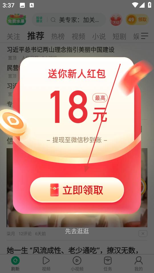 3、打開軟件我們可以看見會給你送一個新人18元紅包,點擊立即領取即可。