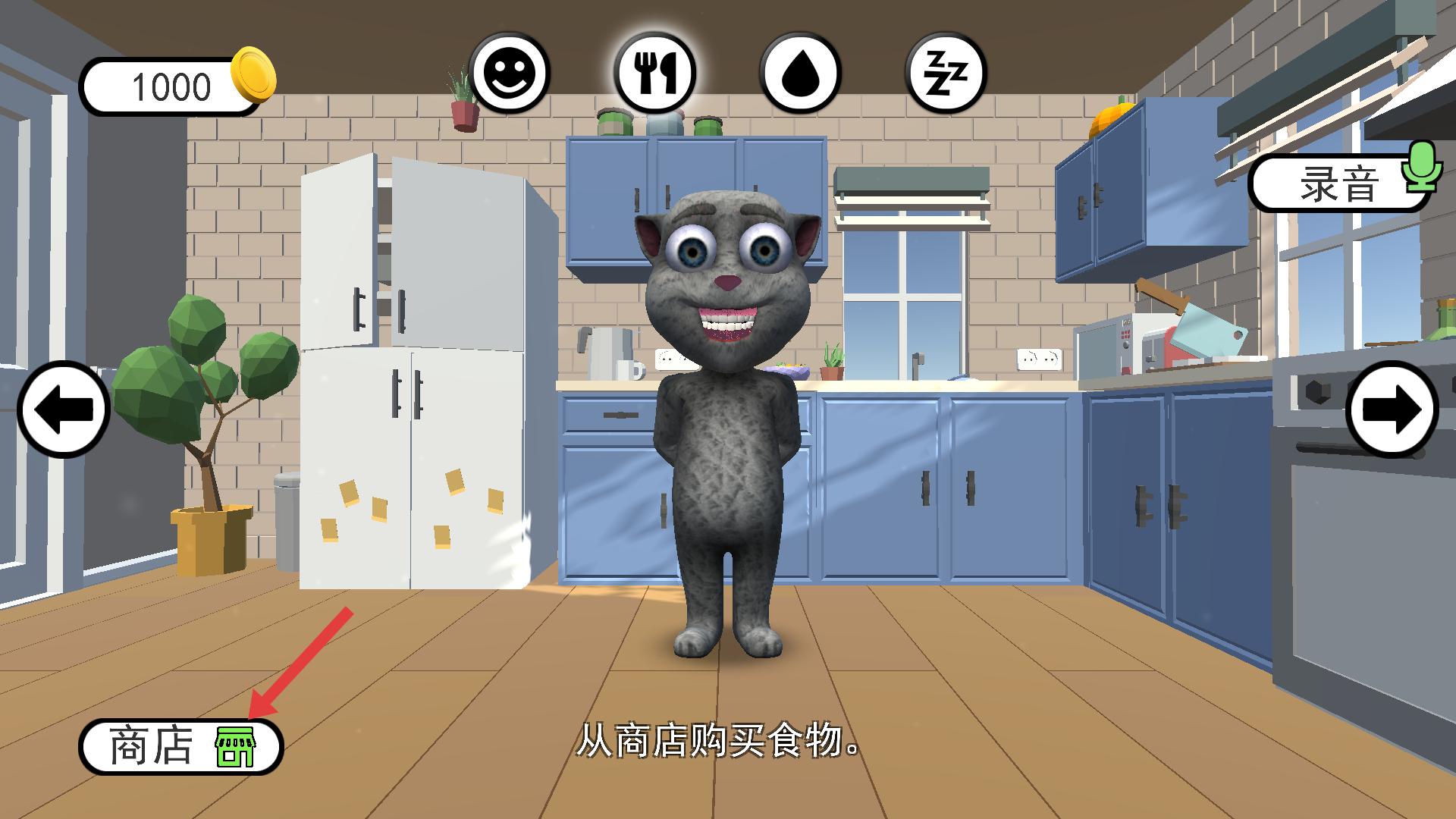 2、在廚房場景,點擊【商店】,進入購物界面,依據貓咪需求,用金幣購買食物,滿足進食需求,維持角色健康狀態。