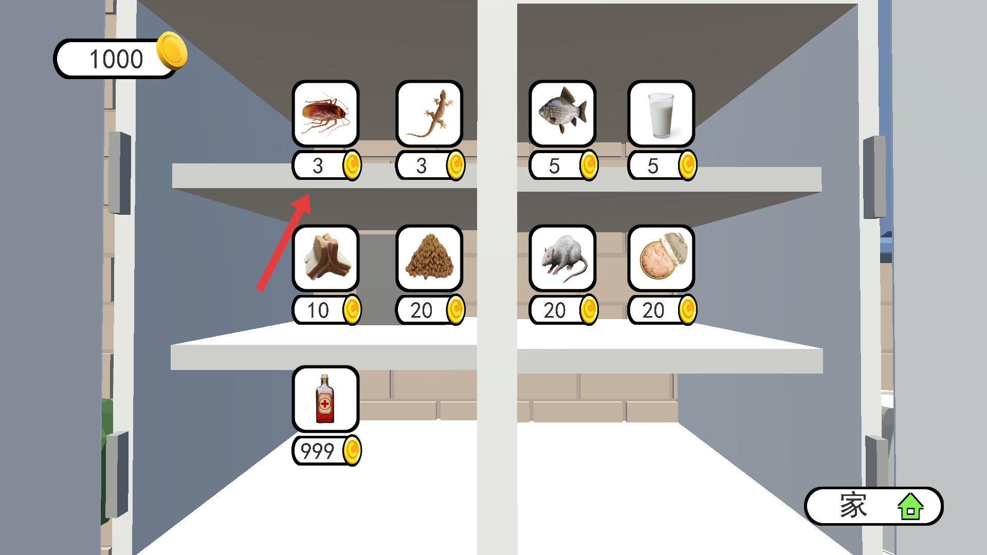 3、商店貨架,選箭頭指的蟑螂,花費3金幣購買,合理規劃金幣,按需選購物品,為貓咪日?;犹峁┪镔Y支持。