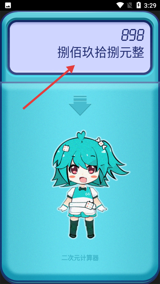 2、圖二展示大寫轉換結果輸入的數字898轉換為捌佰玖拾捌元整,下方是可愛的二次元角色形象。