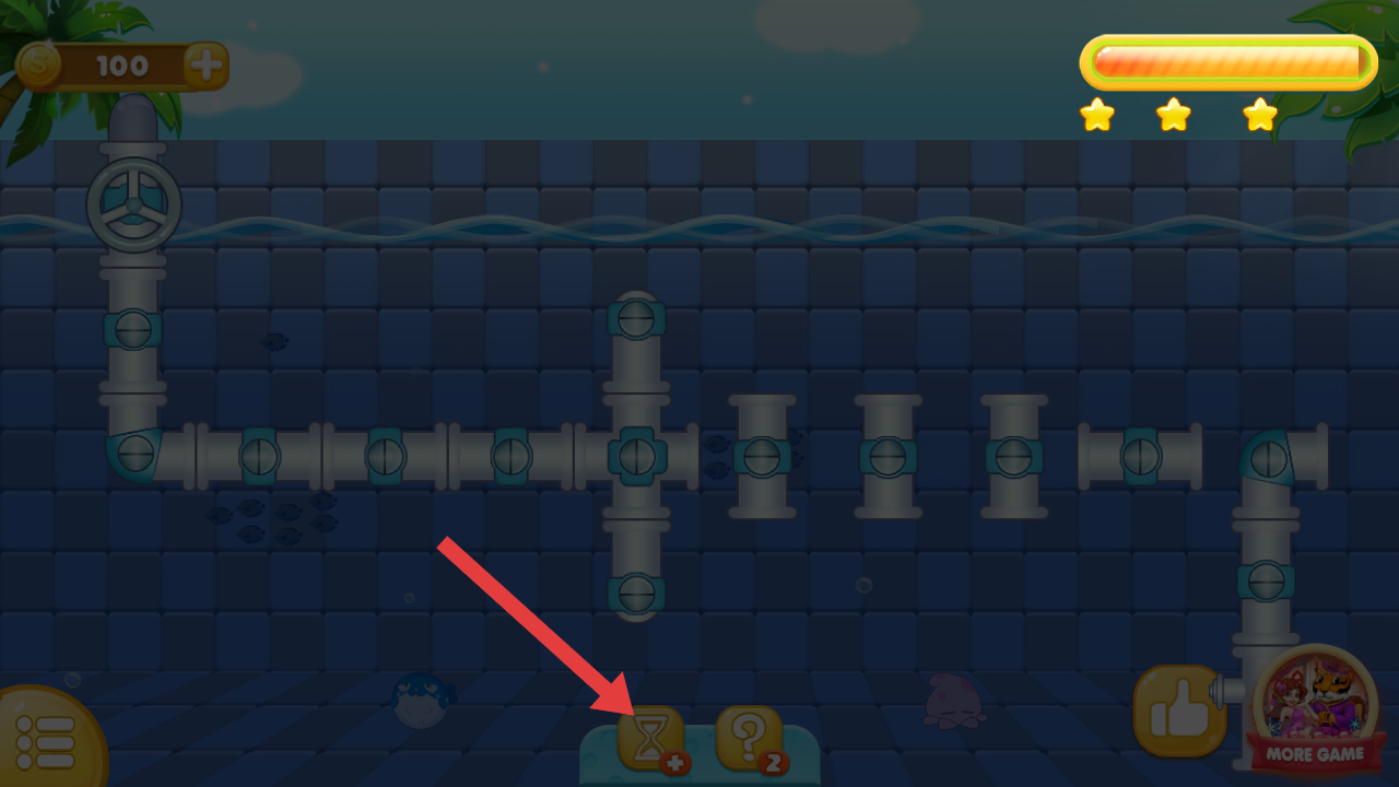 2、若覺得時間緊張,可點擊下方沙漏圖標,能增加游戲時間,讓你有更充足的時間完成水管連接。