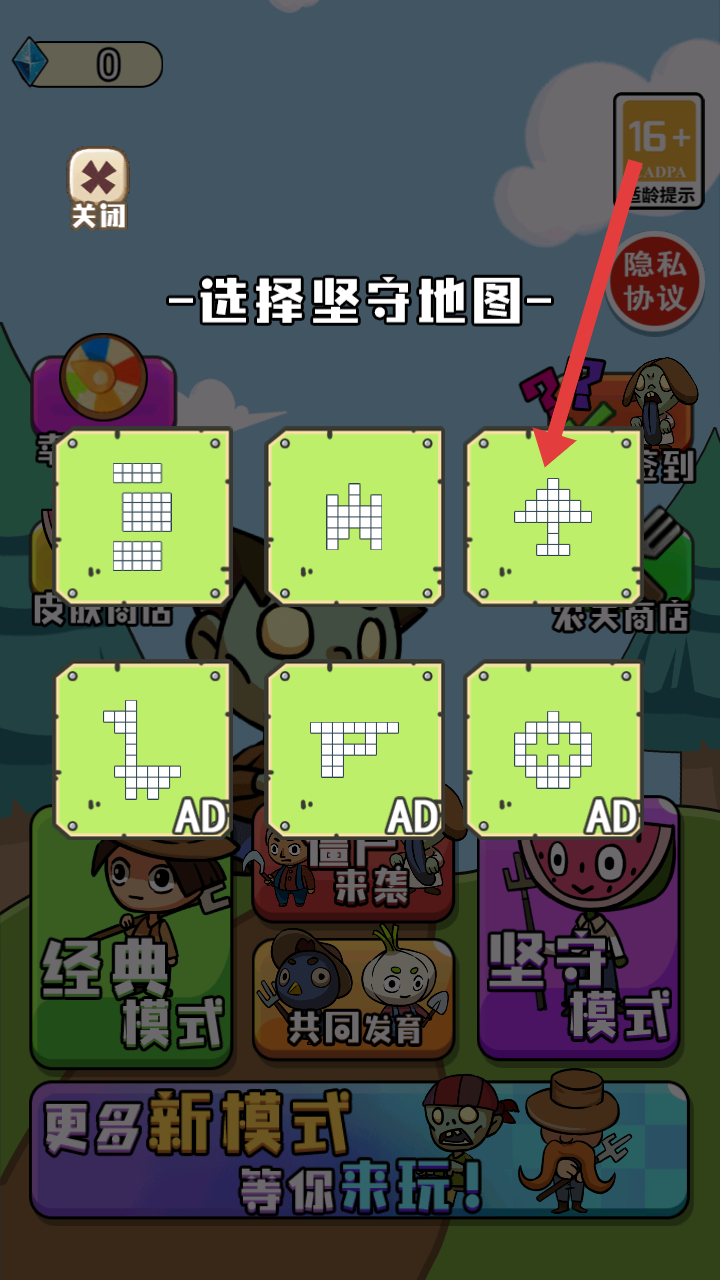1、進入游戲,有許多模式可以挑選,先選擇堅守模式并挑選合適的堅守地圖進行。