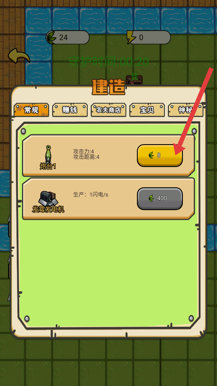 2、建造界面利用葉子等資源,花費8葉子建造炮臺1等防御建筑,也可花費400葉子建造發霉發電機來生產閃電資源。