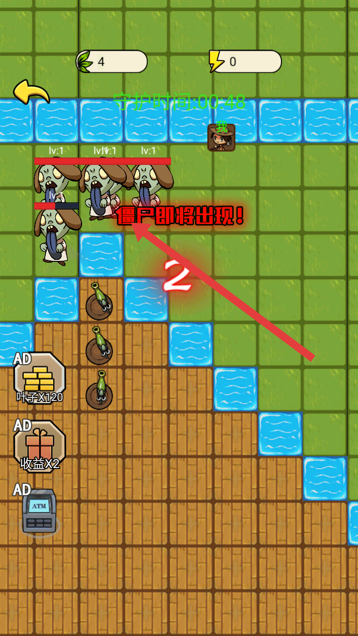 3、部署好防御建筑后,等待僵尸出現,炮臺會自動攻擊來襲的僵尸,點炮臺頭上按鍵可以進行升級。