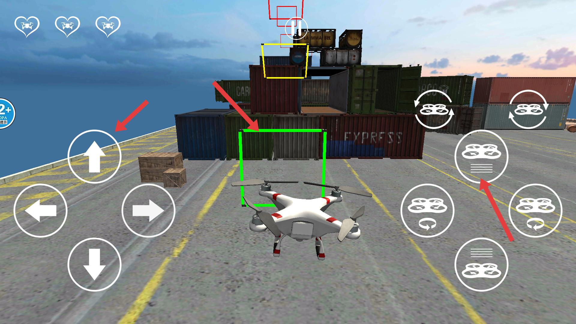 4、飛行時利用界面上的方向按鈕和功能按鈕,操控無人機移動,轉向等,完成關卡任務,體驗真實的無人機模擬。