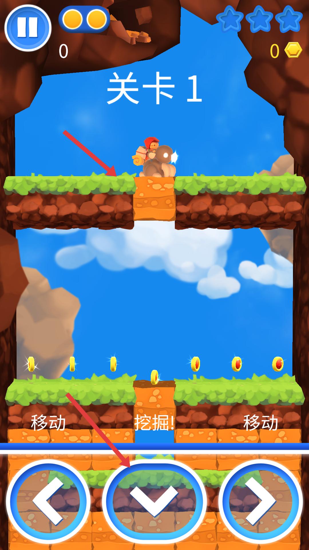 3、進入關卡后,操控角色移動,挖掘,收集金幣等物品,利用下方的移動和挖掘按鈕,在場景里探索推進。