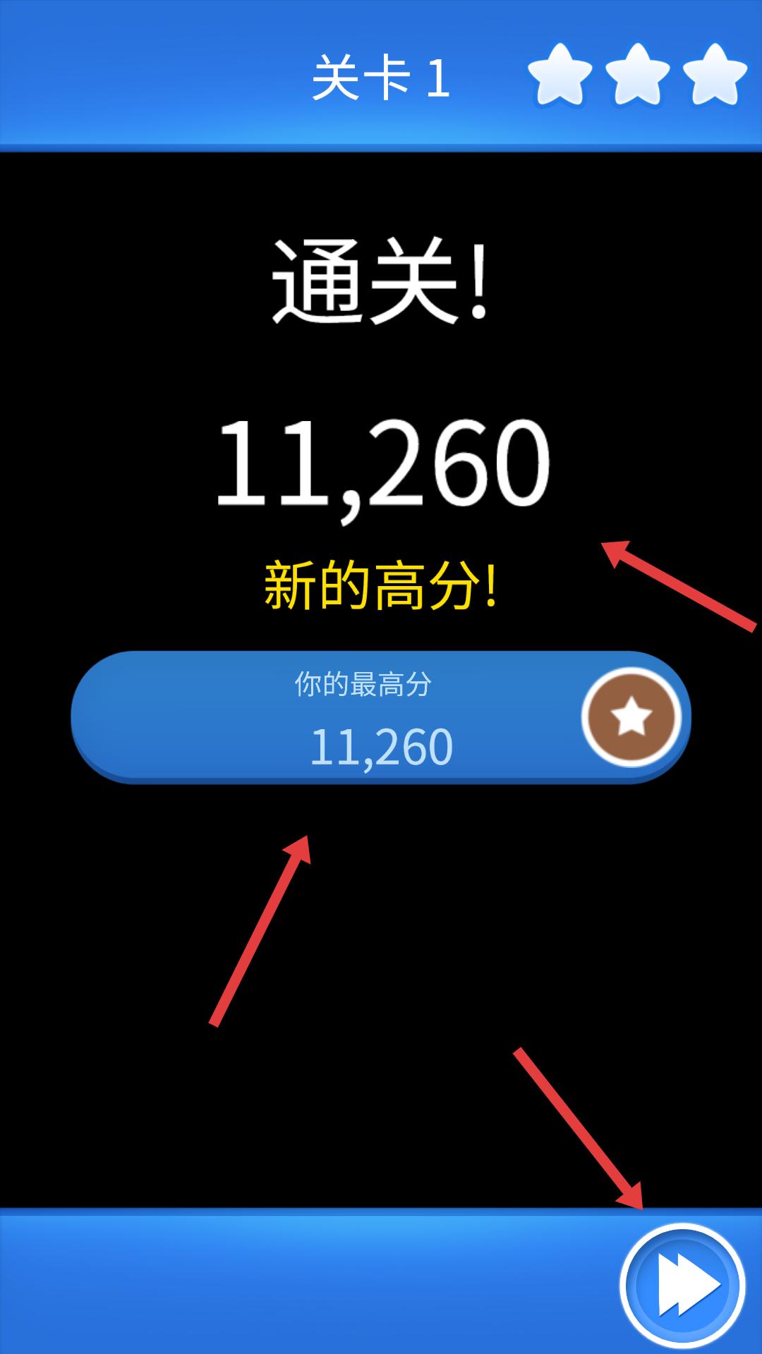 4、成功通關后,會顯示通關的界面,展示得分和新的高分,點擊箭頭按鈕,可繼續挑戰其他關卡。