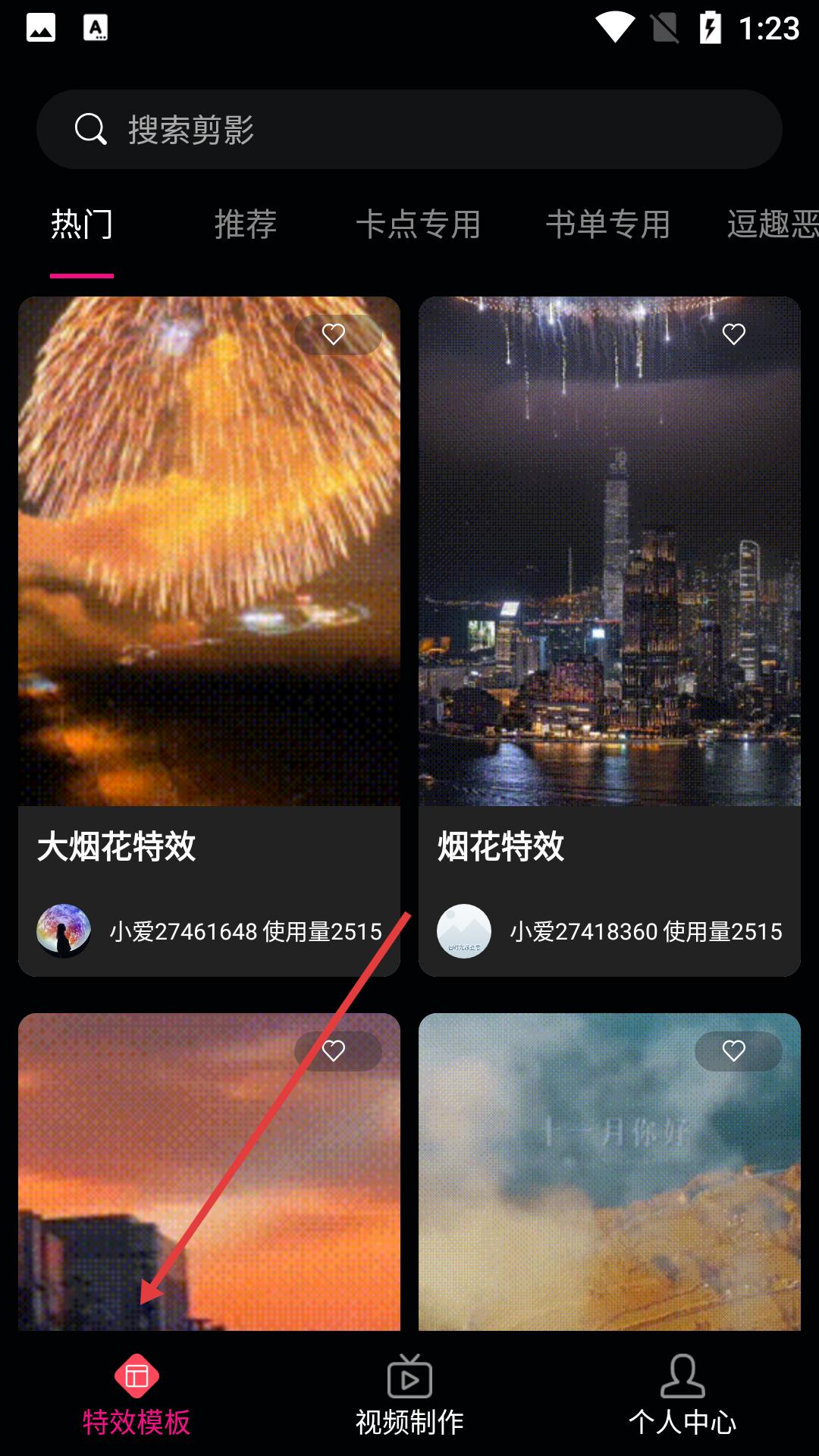 1、在特效模板頁,有熱門分類下的煙花等特效,可瀏覽多樣視頻模板,點對應模板能查看效果,助力視頻創作找靈感。