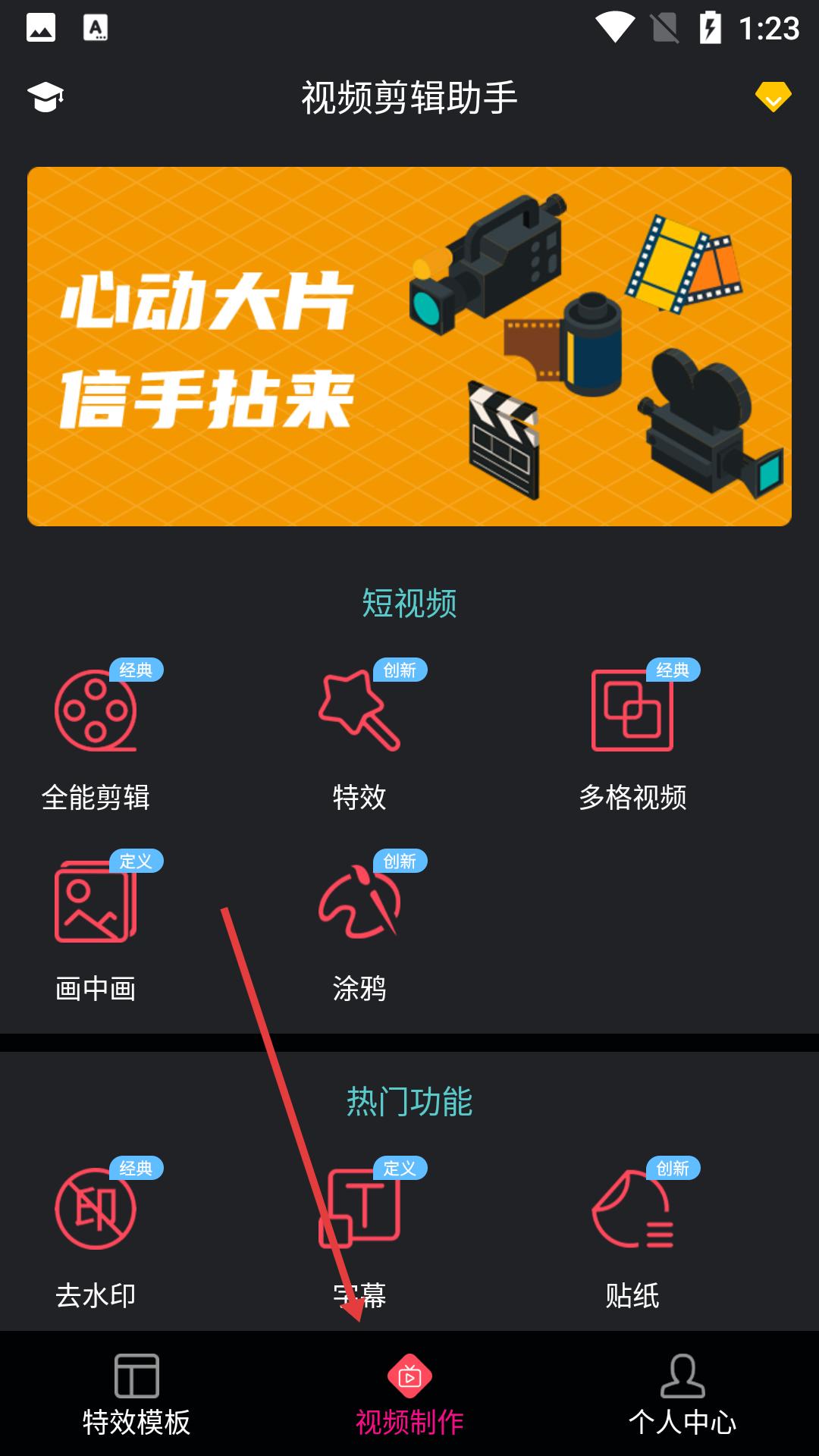 2、切換視頻制作,進入剪輯助手,有短視頻全能剪輯、特效等功能,還有去水印等熱門工具,滿足視頻編輯多樣需求。