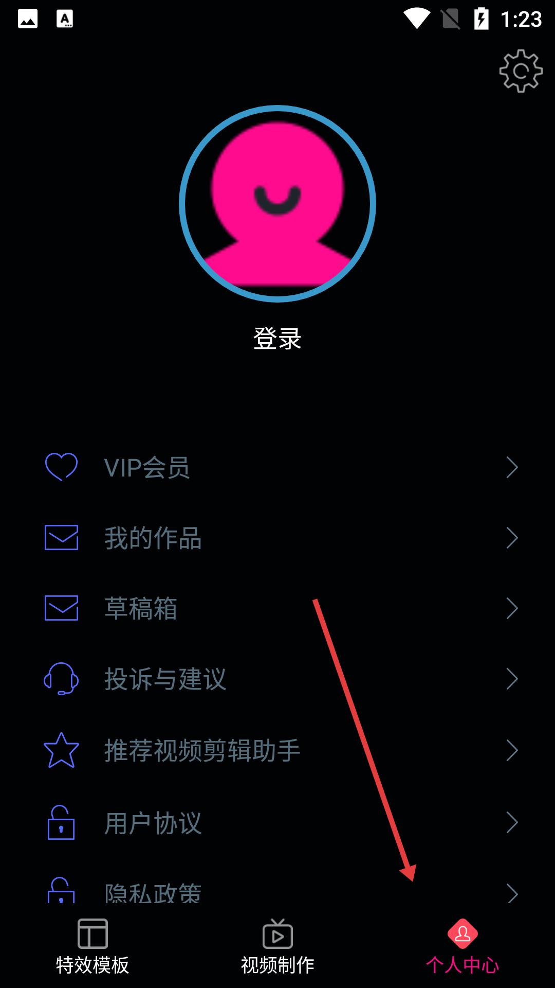 3、進入個人中心需先登錄,可查看VIP會員、我的作品等,還有草稿箱、投訴建議等,方便管理賬號與創作內容。