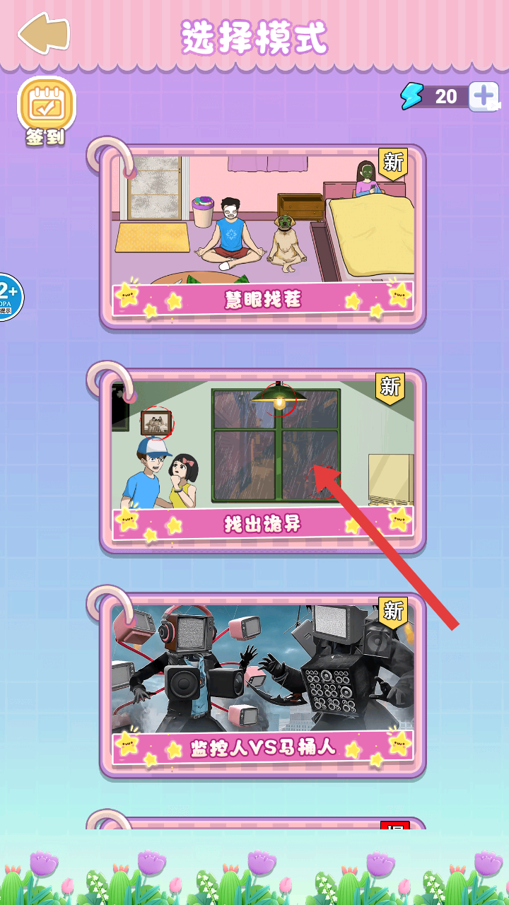 1、進入游戲,選擇模式界面里有非常多模式挑選,選找出詭異模式,開啟找危險預兆的挑戰。