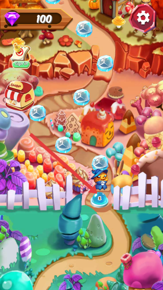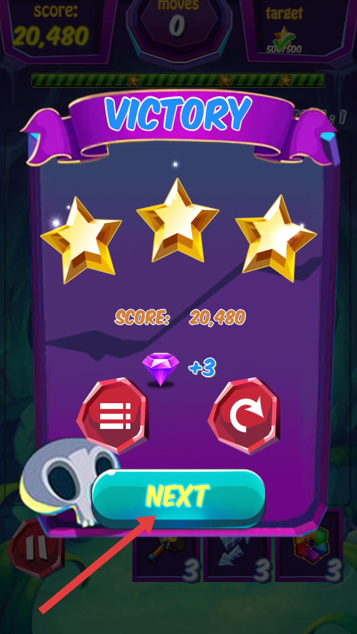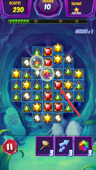 2、關卡內通過移動寶石,讓相同形狀和顏色的寶石連成線,進行消除,同時積累分數。