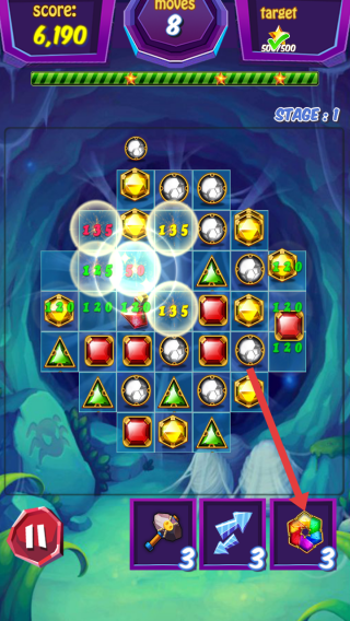 3、若遇到消除困難,可使用下方的道具,像彩色的寶石道具,能幫助快速消除大量寶石。
