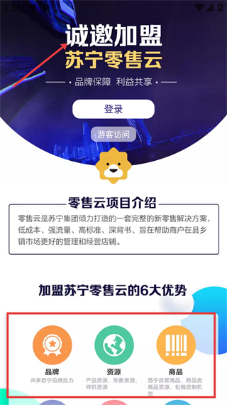 1、加盟首頁展誠邀加盟主題,介紹零售云是蘇寧新零售方案,助縣鄉鎮商戶經營,同時呈現加盟的品牌、資源等優勢。