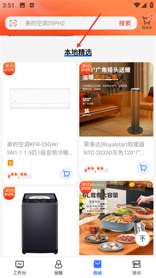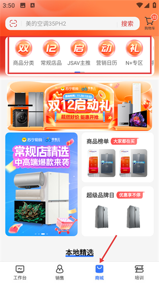 4、本地精選頁展雙12本地商品,含空調等品類,標注價格并提供加購按鈕,是區域商品的展示采購頁。