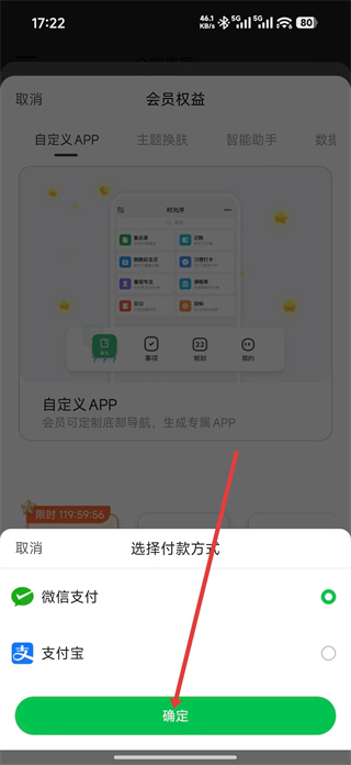 4、在選擇付款方式界面可選擇微信支付或支付寶支付,選定后點擊確定按鈕,即可完成會員開通的付款操作,享受會員權益。