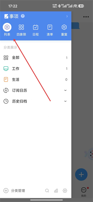 1、進入軟件后點擊列表選項,可查看分類展示的全部、工作、生活等事項分類,還能操作訂閱日歷、歷史歸檔等功能,方便對事項進行分類管理與查看。