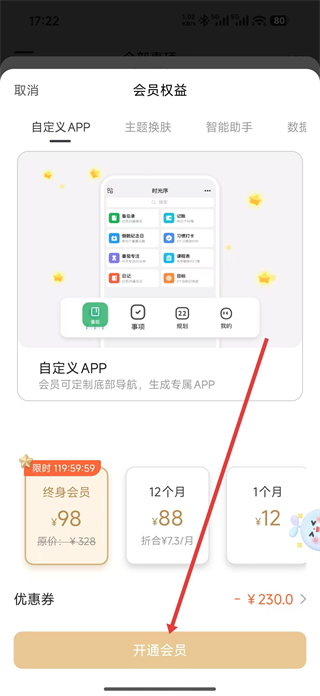 3、進入會員權益界面可了解自定義APP、主題換膚等會員權益,選擇終身會員、12個月會員或1個月會員等套餐,點擊開通會員按鈕即可進入開通流程。