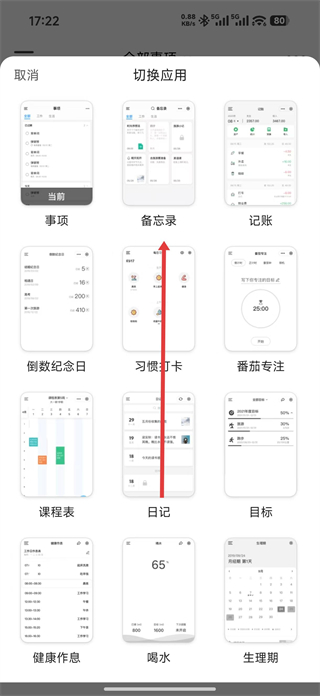 2、可切換應用在事項、備忘錄、記賬、倒數紀念日等多種應用中選擇,比如點擊備忘錄應用。