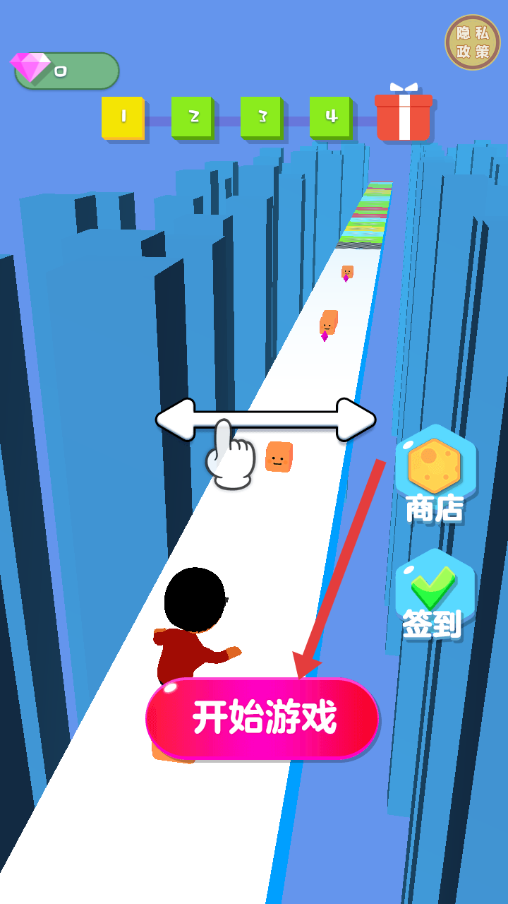 1、進入游戲界面,點擊開始游戲按鈕,操控角色跑道上前進不要掉下去,開啟跑酷挑戰。
