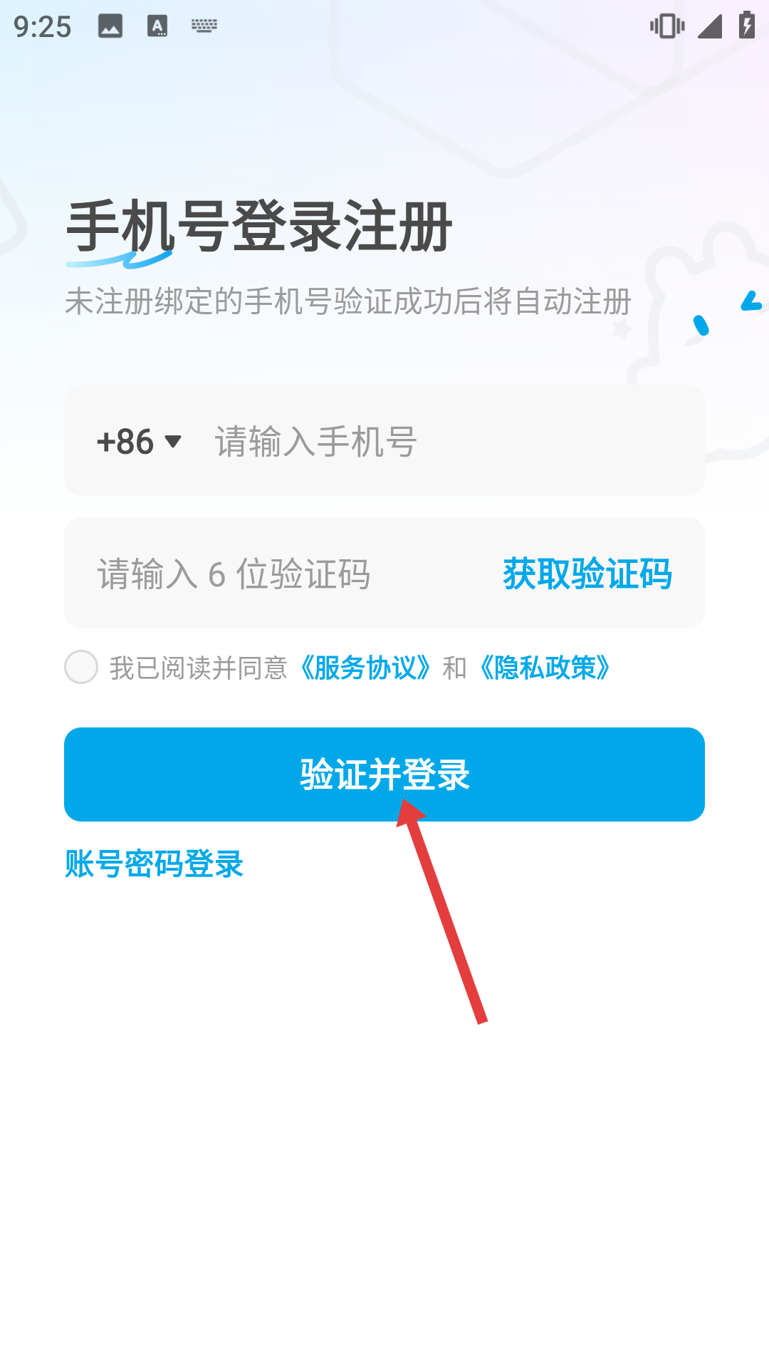 2、進入手機號登錄注冊頁面,輸入手機號和6位驗證碼,勾選同意服務協議和隱私政策,點擊驗證并登錄按鈕完成登錄操作。