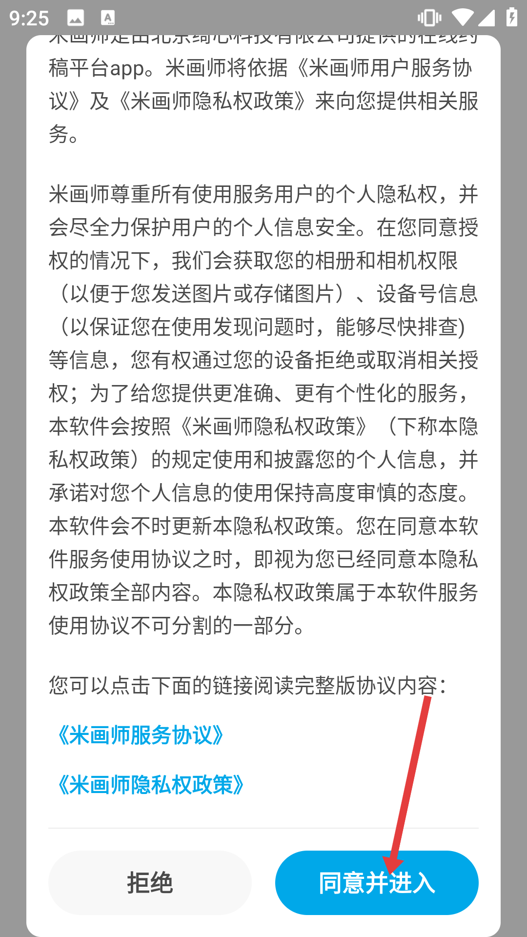 1、打開米畫師軟件,會彈出服務協議和隱私權政策說明,點擊同意并進入按鈕,同意相關協議進入登錄流程。