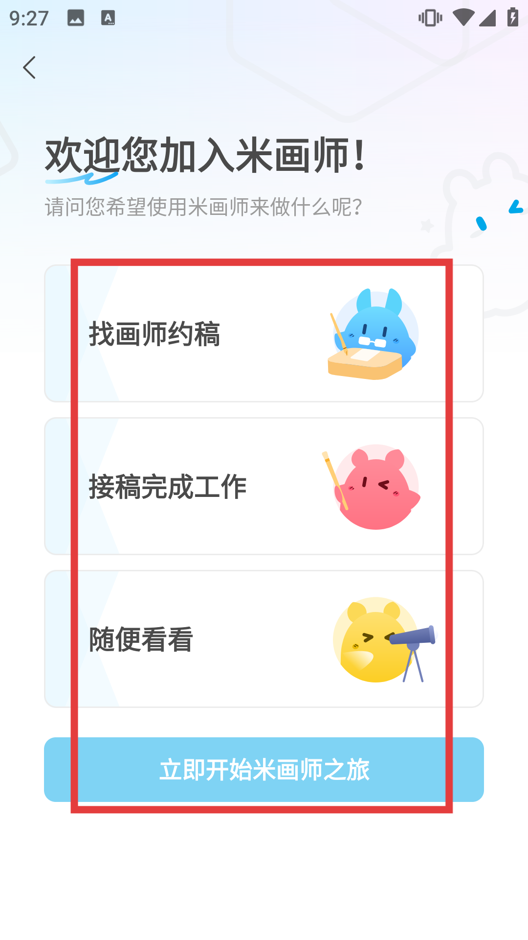 4、注冊完成后選擇使用米畫師的目的,如找畫師約稿、接稿完成工作或隨便看看,點擊立即開始米畫師之旅,正式進入軟件使用。